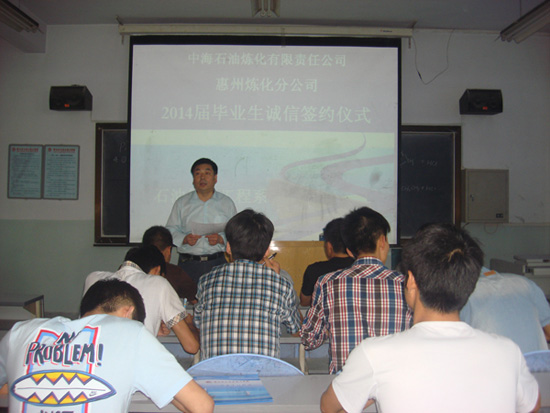 为增强毕业生在求职过程中的诚信意识,石油化学工程系于5月22日下午四点在化工楼201举行中海石油炼化惠州炼化分公司与石化系2014届毕业生诚信签约仪式。系党总支书记呼小洲主持本次仪式,2014届被遴选的毕业生参加签约仪式。