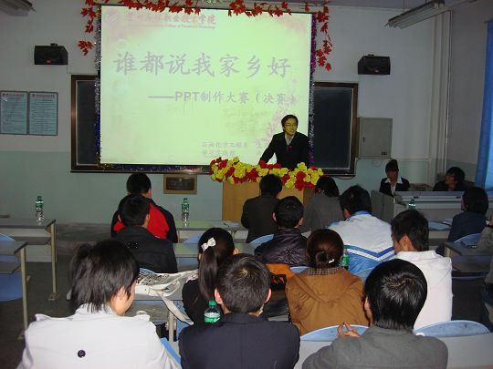 | 为加强学风建设,丰富校园文化生活,提高同学们对Powerpoint演示文稿的认识,进一步提高同学们PPT制作水平,同时也为同学们提供一个自我展现的平台及技能演练的机会,石油化学工程系举办了以“谁都说我家乡好”为主题的PPT设计制作大赛,大赛分初赛和决赛两部分,初赛于3月31日晚上顺利举办,从30余件作品中评选出了11件优秀作品参加决赛。4月2日下午,在化工楼201教室举办了PPT设计制作大赛的决赛,系团总支书记,系辅导员、部分班主任及信控系员工会主席参加了此次活动,并担任评委。