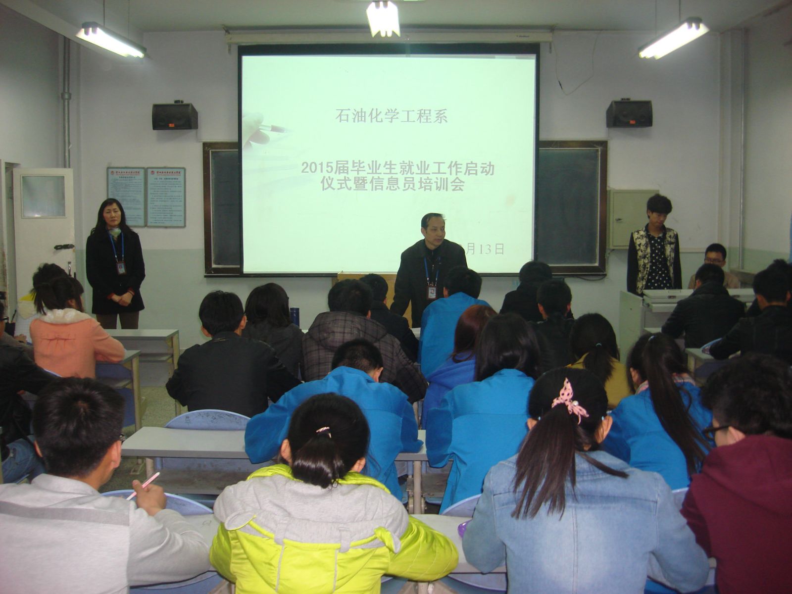 新学期伊始,石油化学工程系为了进一步做好2015届毕业生就业工作,早着手、早准备、早开始、早动员,主动出击、积极谋划,于3月13日晚6点30分在西区化工楼201教室举办2015届毕业生就业工作全面启动仪式暨信息联络员培训会。石油化学工程系党总支副书记唐蓉萍,系辅导员、12级各班班长及信息联络员,共计38人参加了此次会议。