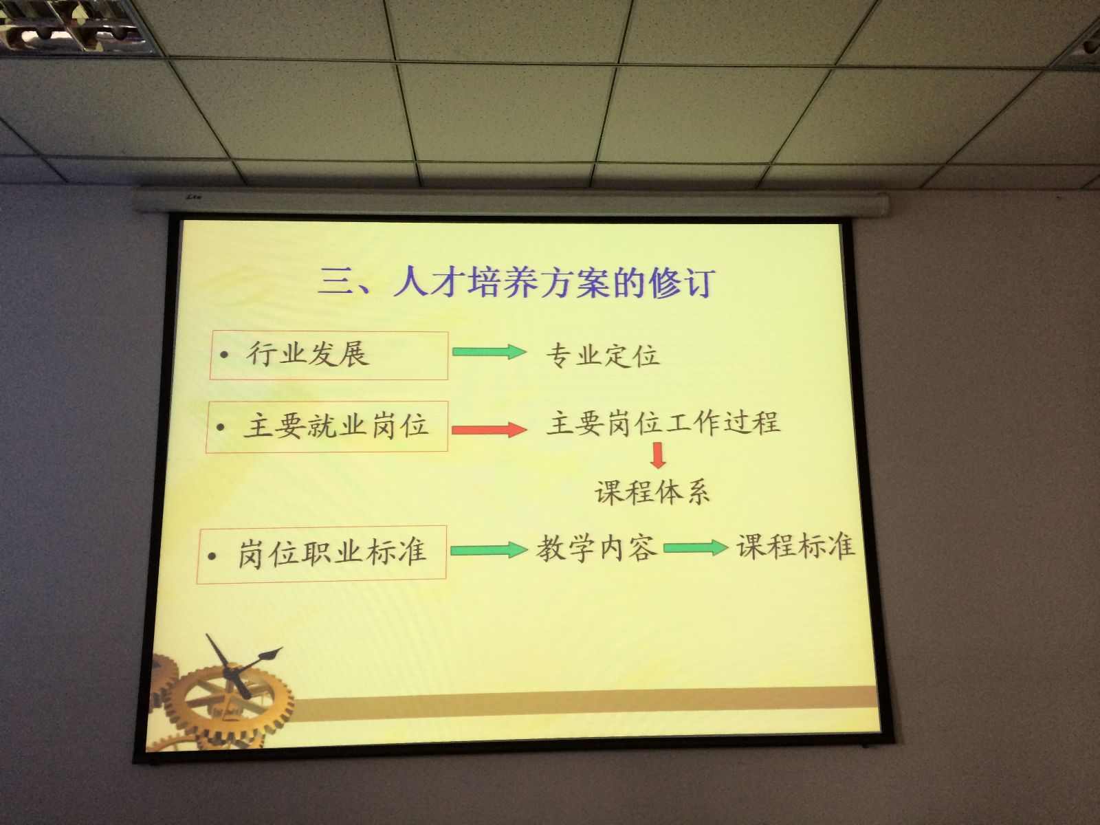 李薇从当前社会形势出发,解读李克强总理关于加快现代职业教育的报告,分析了现代职业教育的新机遇、新挑战,提出了高素质人才培养的三对接:一是专业设置与产业需求相对接、二是课程内容与职业标准相对接、三是教学过程与生产过程相对接。结合这三方面的内容,李薇首先介绍石油化工、煤化工的行业发展情况,提出专业建设要结合行业发展,拓展思路,寻求新突破;其次针对高职生生源结构,学习习惯以及高职毕业生主要在生产服务管理一线的工作特点,注重培养员工具备良好的职业道德,职业精神和行为规范。培养员工养成自信、自尊、自强的心理品质和良好学习习惯,制定合理的人才培养方案、课程体系,因材施教。教学内容科学处理,保证学习有效性。最后李主任提出人才培养方案制定的三个建议:一是专业定位要符合行业发展;二是课程体系要遵循主要就业岗位的工作过程;三是课程标准、教学内容要符合岗位职业标准。