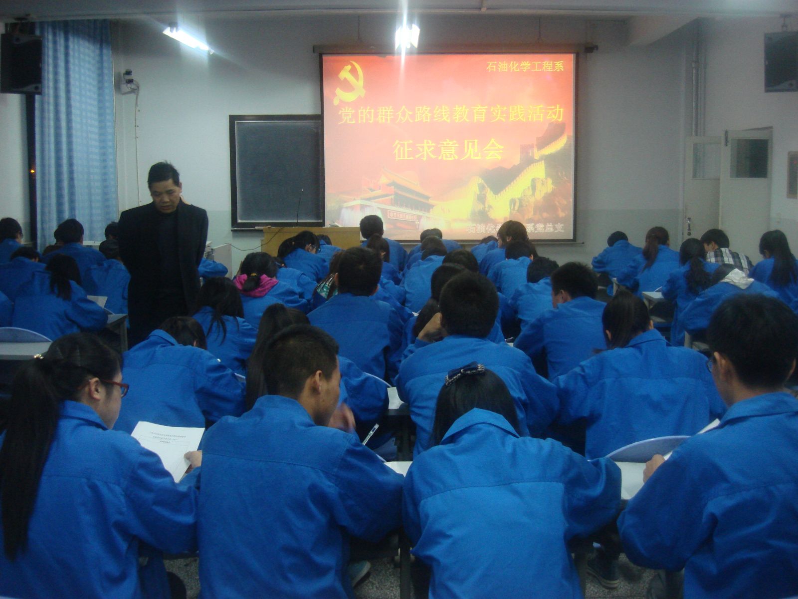 为深入贯彻落实公司关于开展党的群众路线教育实践活动的部署和要求,扎实推进群众路线教育实践活动工作,同时为了了解同学们在日常生活中遇到的困难,解决我系同学所关心的焦点问题,加强我系学风建设。4月20日晚7点半,石油化学工程系员工党员于化工楼209教室组织开展党的群众路线教育实践活动征求意见会。本次会议由系辅导员李胜泥主持。石化系12级预备党员共计80人参加了此次大会。
