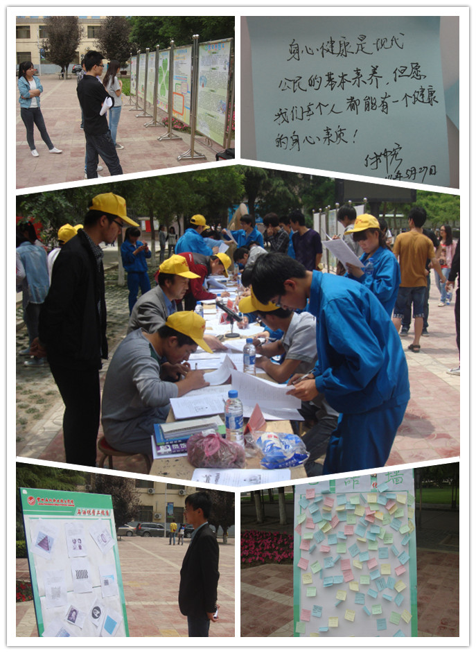 本次活动通过展板为西区同学们普及心理健康知识的同时,主要为同学们提供现场心理测试、现场心理咨询等相关服务。以期缓解员工的心理压力、心理焦虑,指导员工合理正确运用心理健康知识及时调整自己,走上正确的心理暗示轨道。测试主要包括老员工人格测试、职业兴趣测试、职业价值测试、霍德兰职业兴趣测试量表、症状测试量表、抑郁症测试焦虑症测试、青少年生活事件测试量表、人际关系测试量表等。活动现场,同学们积极主动、热情高涨、络绎不绝、十分重视的做着各种问卷,之后纷纷咨询了现场的心理指导老师,以对测量结果进行指导性分析。通过老师的悉心指导,所有前来测试的员工都对自己的心理状况有了更为全面地了解。同学们在与老师们交流之际,都将自己的烦恼纷纷向老师们倾诉,与老师们进行敞开心扉的交谈,活动现场老师们耐心热情的开导每位前来咨询的同学都收到了莫大的鼓舞,并表示在今后的学习生活中,一定要面对生活要积极乐观,虽然在日常生活中有时会有挫折感,但只要有对幸福、自由、友谊和爱情的感知能力,只要心中充满希望,有自己的信仰,并为之默默付出努力、奋斗,那么在面对挫折、艰难、失败时,就一定是赢家!
