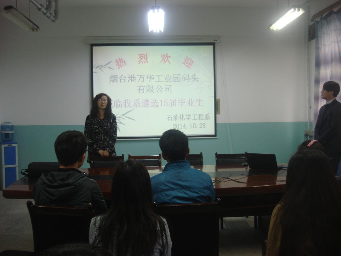 10月28日上午,烟台港万华工业园码头有限公司张总一行二人莅临石油化学工程系遴选2015届毕业生。石化系党总支副书记唐蓉萍、主管就业老师于爱平及12级未就业员工60余人参加了本次招聘宣讲会。会上,招聘人员就公司股东、公司文化、企业文化、薪酬福利等方面向大家进行了详细的介绍。会后,对该公司有意向的同学参加了面试。