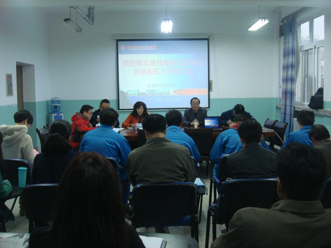 唐蓉萍代表系领导班子做了总结报告。自开展党的群众路线教育实践活动以来,石油化学工程系认真贯彻落实中央和省委有关要求,严格按照公司教育实践活动领导小组工作安排,在全系师生党员共同努力下,以“照镜子、正衣冠、洗洗澡、治治病”为总要求,以为民务实清廉为主题,以反对“四风”、聚集员工、服务师生为重点,深入开展了活动。主要措施是活动准备力求“三个到位”、活动开展狠抓“三个紧扣”。特色做法有:积极推进公司2014年度6项重点改革,全力落实拔尖员工培养;构建石化系毕业生就业指导联动机制,关注行业企业动态, 促进员工充分就业; 以工作任务为载体强化了员工党员的教育与管理,充分发挥员工党员先锋模范作用;建设有效课堂,促进学风建设;利用校企合作项目,不断深化校企融合。通过以上措施和特色做法,石化系教育实践活动也取得了良好成效,广大党员受到了教育,提高了贯彻党的群众路线的自觉性和坚定性;“四风”问题得到了有力整治;系领导之间、领导与教师和员工之间、班主任与员工之间、辅导员与员工之间的谈话活动比以前多了,通过召开专题民主生活会,批评与自我批评的优良传统进一步发扬;聚集员工,以转作风、改作风为重点的制度体系更加完善。