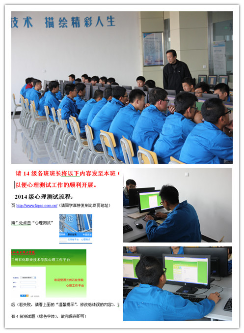 在测量工作工程中,我系利用午间休息阶段、周末、下午及晚上时间段按照实施计划、进行相关培训演示、并严格按照安排顺序、高度灵活的原则有序测试。同学们都能够认真对待,仔细答题,在遇到困难时都能够积极踊跃的提问,公司心理健康指导中心王彦荣、周红燕老师、系辅导员在第一现场为员工做了相关辅导,最终,石化系2014级20个班级陆续顺利完成了心理健康普查测试工作。