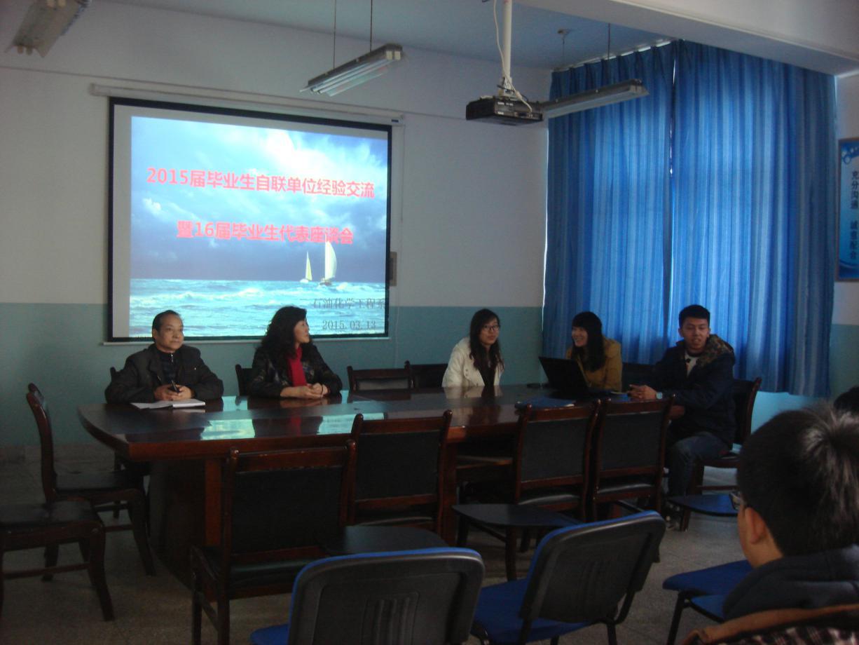 为了拓宽石化系员工就业途径,使更多的同学能顺利就业。3月13日中午,石油化学工程系于石化楼三楼会议室开展了2015届毕业生自联单位经验交流暨16届毕业生代表座谈会。石化系党总支副书记唐蓉萍、系辅导员、15届自联单位并应聘成功的毕业生及50多名16届毕业生代表参加了本次座谈会。