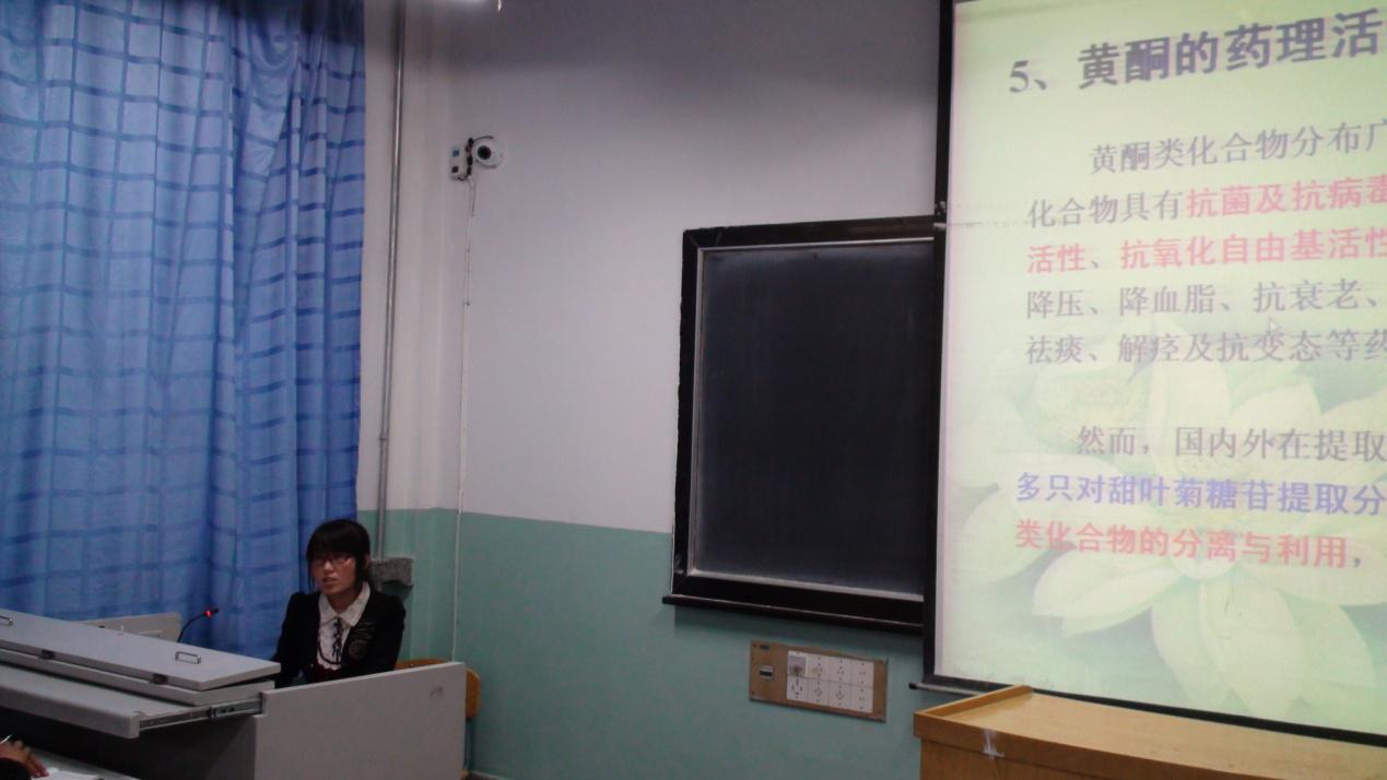 王红玉老师从甜叶菊的综述、甜叶菊总糖苷的提取及纯化研究、甜叶菊总黄酮的提取及纯化研究、甜叶菊糖苷及总黄酮抗自由基研究几个方面介绍了她在硕士期间做的相关研究。王老师结合自身丰富的专业知识、从实际生活出发,生动的介绍了甜叶菊与生活的相关知识。
