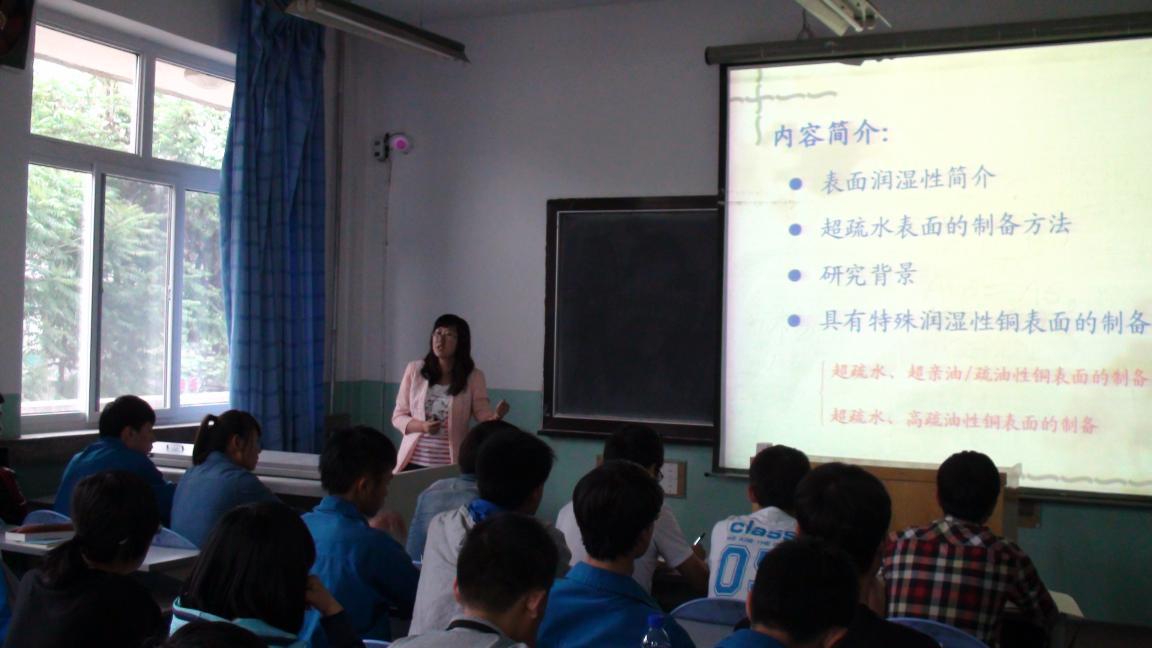 代学玉老师以其丰富的专业知识和工作经验从表面湿润的简介、超疏水表面的制备方法、研究背景及具有特殊湿润性铜表面的制备等四个方面进行了深入浅出的介绍了她的研究工作,她还针对超疏水、超亲油/疏油性铜表面的制备及超疏水、超疏油铜表面的成功制备案列在实际生活中的应用对同学们做了详细的介绍。