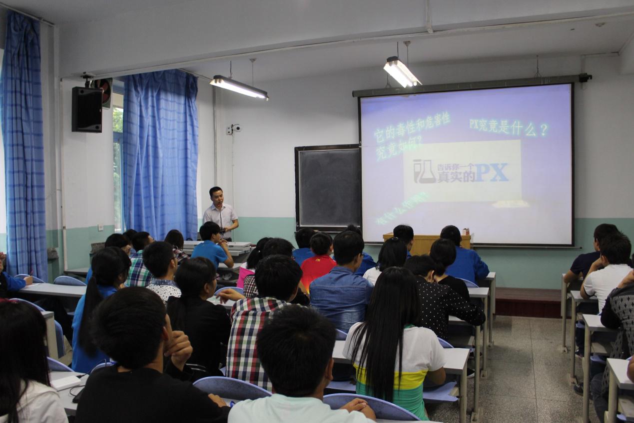 颉林老师首先向同学们讲述了目前人们对PX的错误认识,以及反对PX的事件。紧接着他以幽默风趣的语言向同学们介绍了PX到底是什么、PX的毒性和危害性到底如何、有何作用、主要用于什么领域,为同学们解开了谜团。最后,颉林老师针对我国PX的生产现状、生产技术以及重要性做了详细介绍。