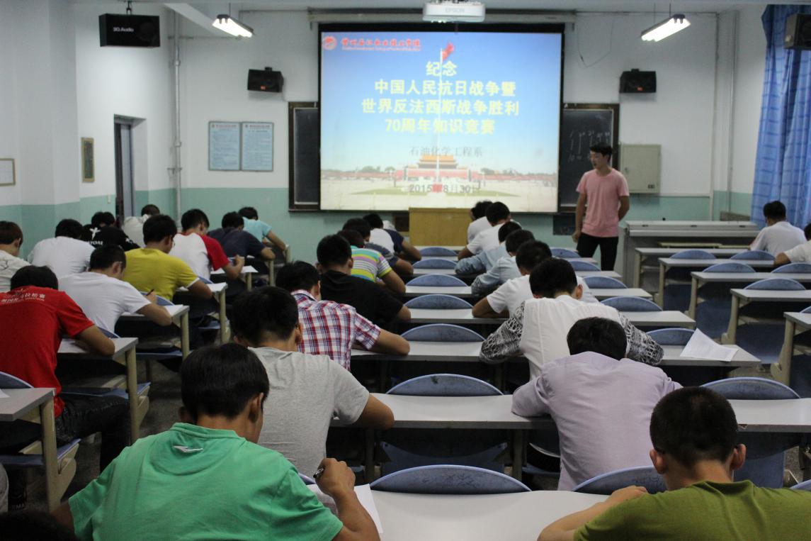 为纪念中国人民抗日战争暨世界反法西斯战争胜利70周年,让青年员工更好地牢记历史、珍视和平,石油化学工程系于8月30日晚在化工楼201、207和综合楼206、306四间教室开展了纪念中国人民抗日战争暨世界反法西斯战争胜利70周年知识竞赛,14级员工约200余人参加了此次竞赛。