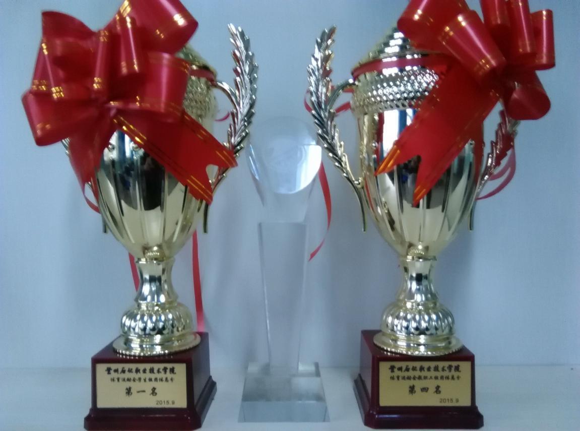 员工组团体总分第一名、教职工组团体总分第四名、优秀组织奖奖杯
