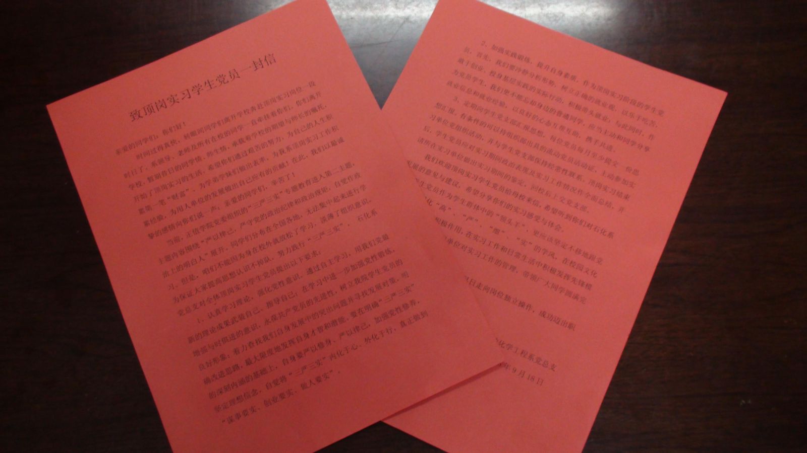 信中,石化系以最诚挚的感情给顶岗实习党员道出:亲爱的党员同学们,你们辛苦了。提出当前正值公司党委组织的“三严三实”专题教育进入第二主题,围绕“严以律己,严守党的政治纪律和政治规矩,自觉作政治上的明白人”展开。为使顶岗实习党员不放松学习、强化组织意识,保证在思想认识上不掉队,在实习岗位上努力践行“三严三实”,石化系党总支特对全体定岗实习员工党员提出三方面的要求,即认真学习理论,强化党性意识;加强实践锻炼,提升自身素质;定期向员工党支部汇报思想,每位党员每月至少提交一份思想汇报。并希望顶岗实习员工党员给母校来信,听到他们对石化系发展的意见与建议,希望分享他们的实习感受与体会。
