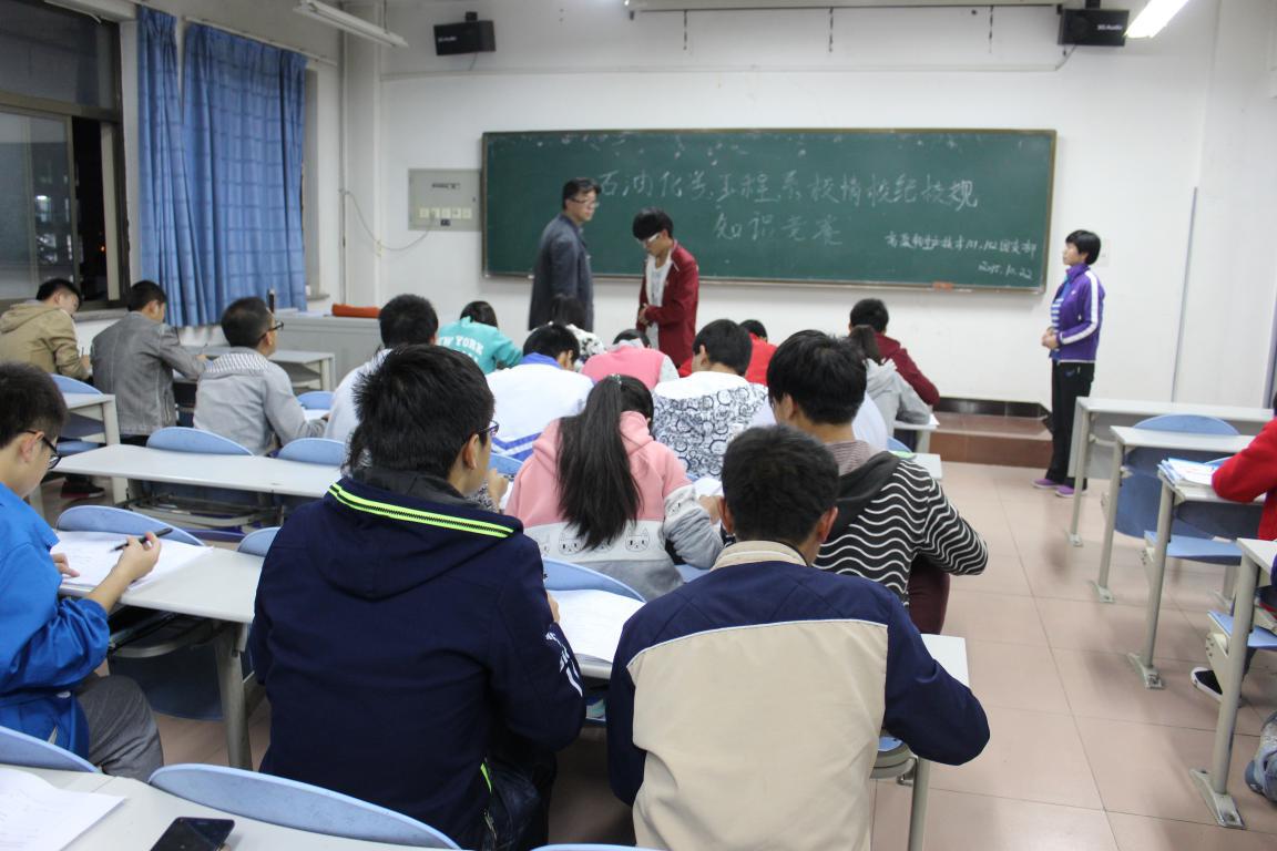 为了促使2015级新生全面了解公司校情、进一步熟悉公司的学风建设和校园文化建设的具体要求和管理理念,全面推动石化系规范性、标准化员工管理,建立员工自我管理素质的特色化发展体系,石油化学工程系于10月22日晚7点半,在2015级各班自习教室开展了“校纪校规”知识竞赛,2015级全体新生参加了此次竞赛,竞赛由各班主任亲自监督,系领导、辅导员对各班级进行了督察。