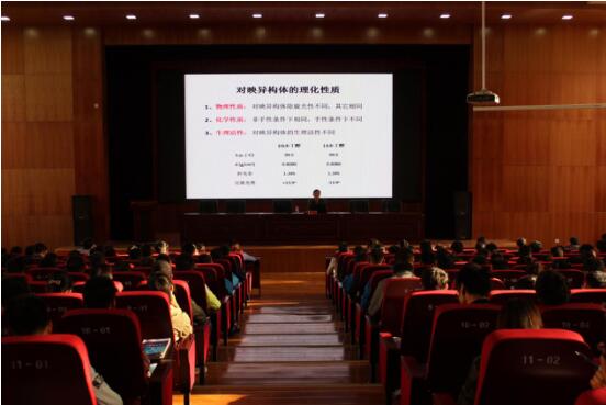 在党总支副书记唐蓉萍对周鹏鑫教授做个人简介后。周副教授首先对手性现象及手性化合物对生物与环境的影响进行了研究背景介绍。随后,周副教授对手性化合物的理化性质及其构效关系进行了专业的介绍与解答。最后,周副教授通过丰富的专业知识结合实际工作经验对手性化合物与人类健康、手性分子精细合成技术进行了全面阐述。