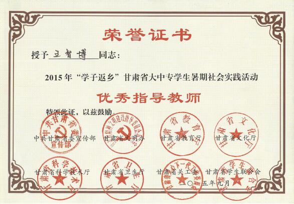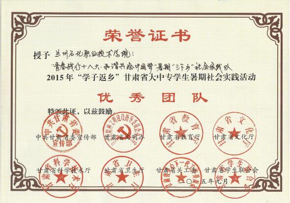 近日,中共甘肃省委宣传部、省文明办、共青团甘肃省委、省教育厅、省科技厅、省文化厅、省卫生厅、省广电局、省关工委、省学联等单位联合发文,对2015年甘肃省大中专员工志愿者暑期“三下乡”社会实践活动先进集体和个人进行表彰。石油化学工程系荣获2015年甘肃省大中专员工志愿者暑期“三下乡”社会实践活动优秀团队奖、授予王智博老师2015年“学子返乡”甘肃省大中专员工暑期社会实践活动优秀指导教师奖。