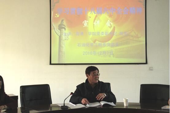 根据公司党委《关于认真学习贯彻党的十八届六中全会精神的通知》要求,12月7日下午,公司党委副书记、经理高溥到党员活动中心宣讲十八届六中全会精神,石化系教工党员、教师代表参加了学习。
