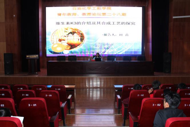 5月26日下午,beat365在线官网入口在西区报告厅举办了主题为《维生素K3的介绍及其合成工艺的探究》的教师学术论坛。此次论坛田苗老师主讲,16级部分班级的200多名同学到场参加。
