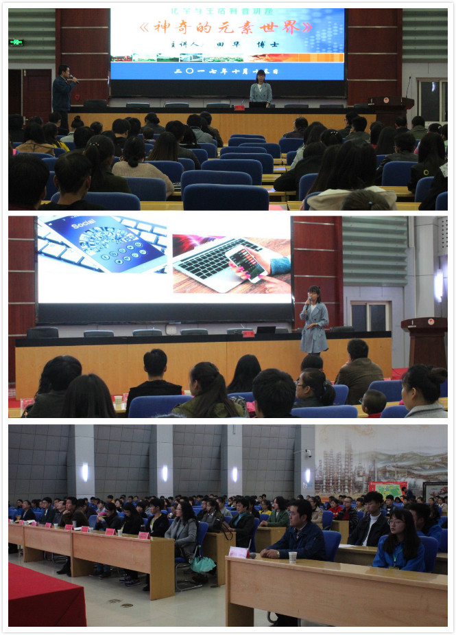 为引导员工认识和理解生活中的化学现象,关注社会和生活中的化学问题,提高基本的科学素养,10月13日下午,赛会还举办了科普报告会,来自全省10所参赛院校代表队全体成员参加了报告会。科普报告会由兰州石化职业技术公司副教授田华博士主讲。田华博士曾获得第二届甘肃省科普讲解大赛二等奖,被授予“十佳科普使者”的荣誉称号。田华博士以《神奇的元素世界》为主题,分别以“锂电池的那些事儿”、“烟花的那些事儿”、“喝酒的那些事儿”三个版块从元素周期表的产生、锂电池的发展及其使用的利弊、元素各种反应的特点与现象以及酒精的危害与利用等方面做了详细的报告。