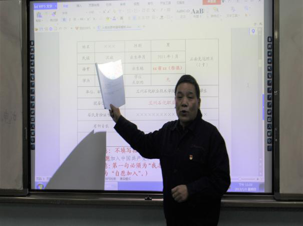 培训会上,辅导员传达了公司党委组织部关于加强党员管理精神,强调党员档案管理重要性,以PPT的形式讲解如何填写入党志愿书,对党员档案内容做了规范,对党员档案资料填写的时间、方法、格式、笔体等内容做了讲解,对于重点填写内容着重讲解、特别提醒,提出了要求。培训中党员发展对象听讲认真,做了笔记。