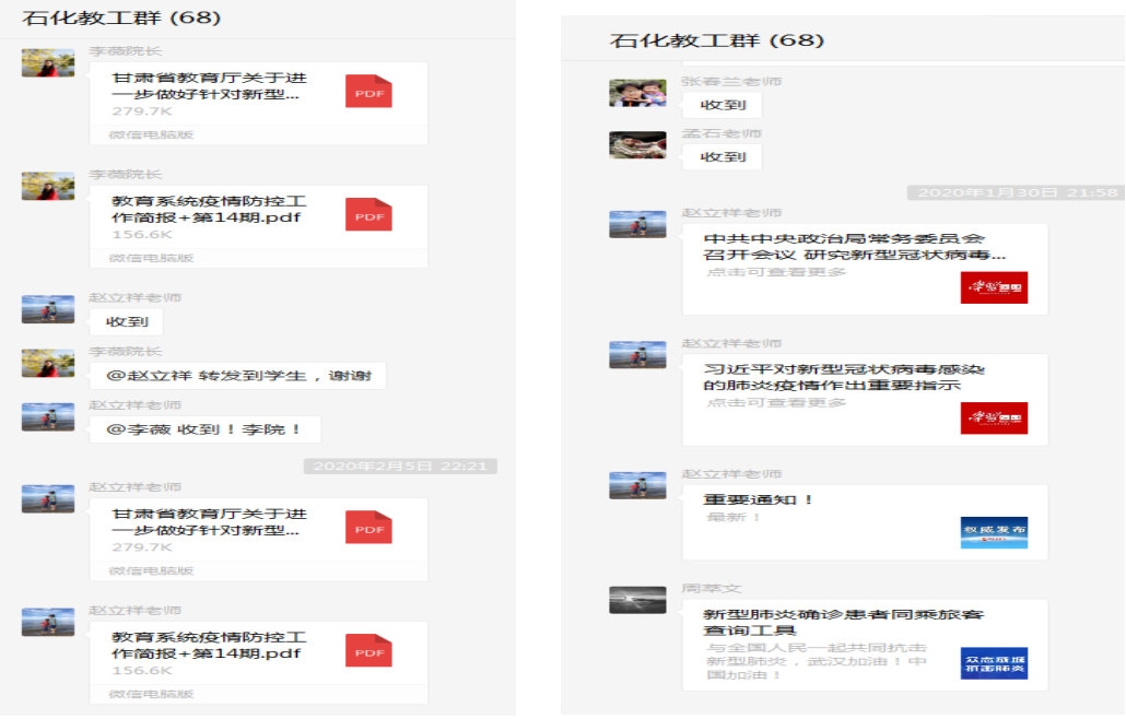 公司组织辅导员班主任和全体员工深入学习贯彻落实习近平重要指示和党中央、国务院重要部署,及甘肃省教育厅、公司重要文件精神,积极贯彻落实各项精神;要求班主任召开班级视频会议,发出倡议:a.非必要,不外出;b.勤洗手、戴口罩、不聚会;c.科学预防、不造谣、不传谣;d.严谨自律、合理作息;做到人人学习、入脑入心,坚决执行“疫情就是命令、防控就是责任”。