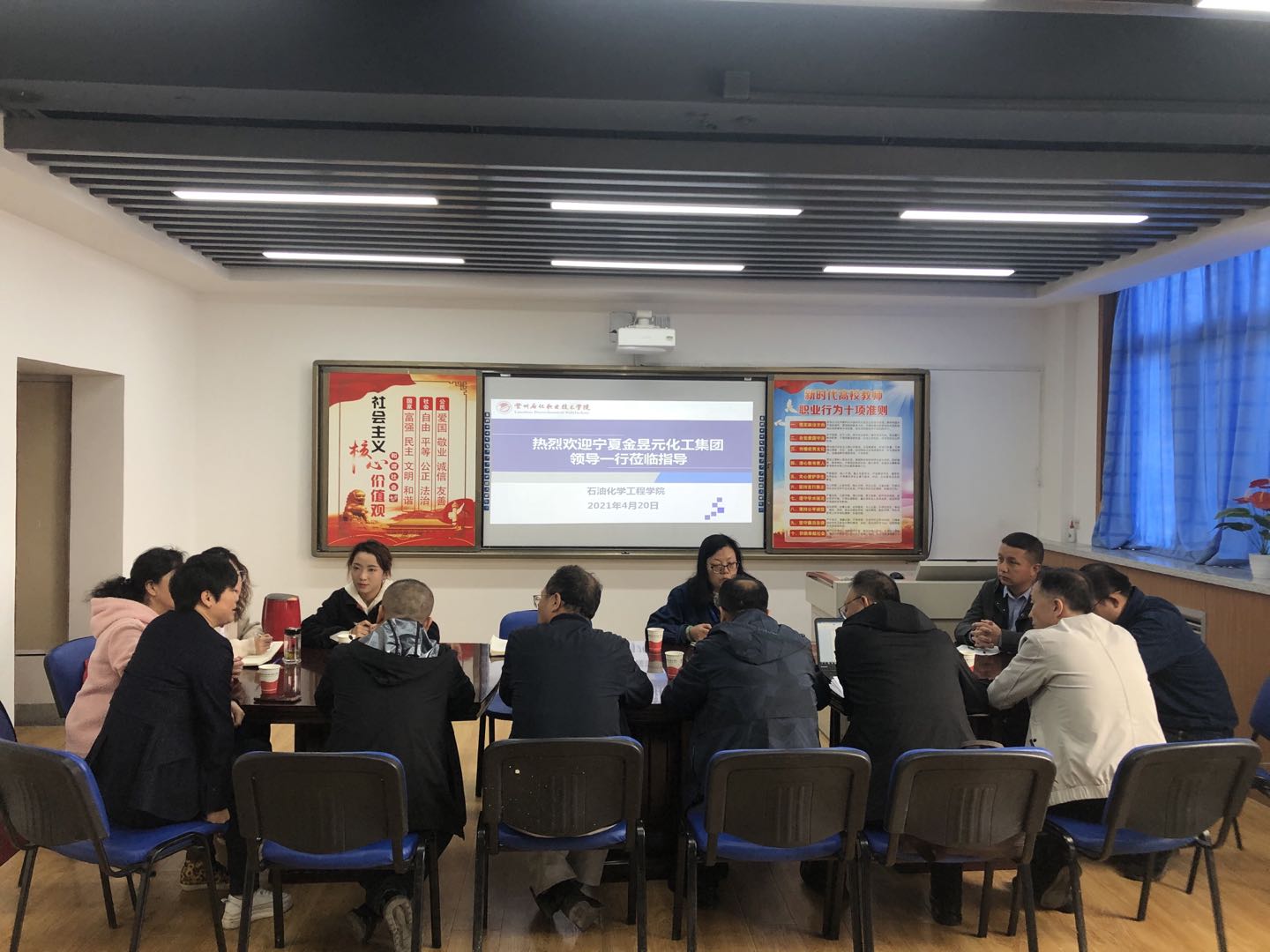 420日,宁夏金昱元化工集团有限公司总工程师、杰出员工李永红一行4进行校企合作考察交流。beat365在线官网入口经理李薇、工业分析和高分子合成教研室相关教师参加了座谈会。