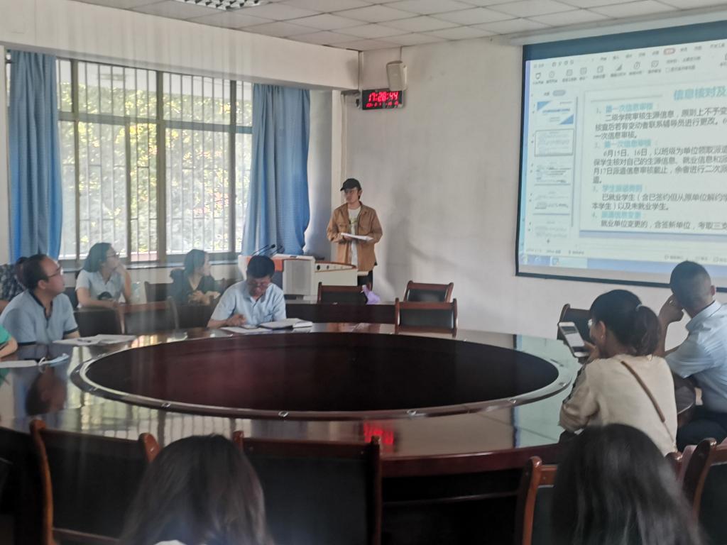 席满意就顶岗实习工作中容易存在的问题进行了讲解,通报了五月份班主任考核情况;各辅导员就毕业生派遣中信息核对及日程安排、员工档案管理、毕业证发放等进行了详细的讲解。
