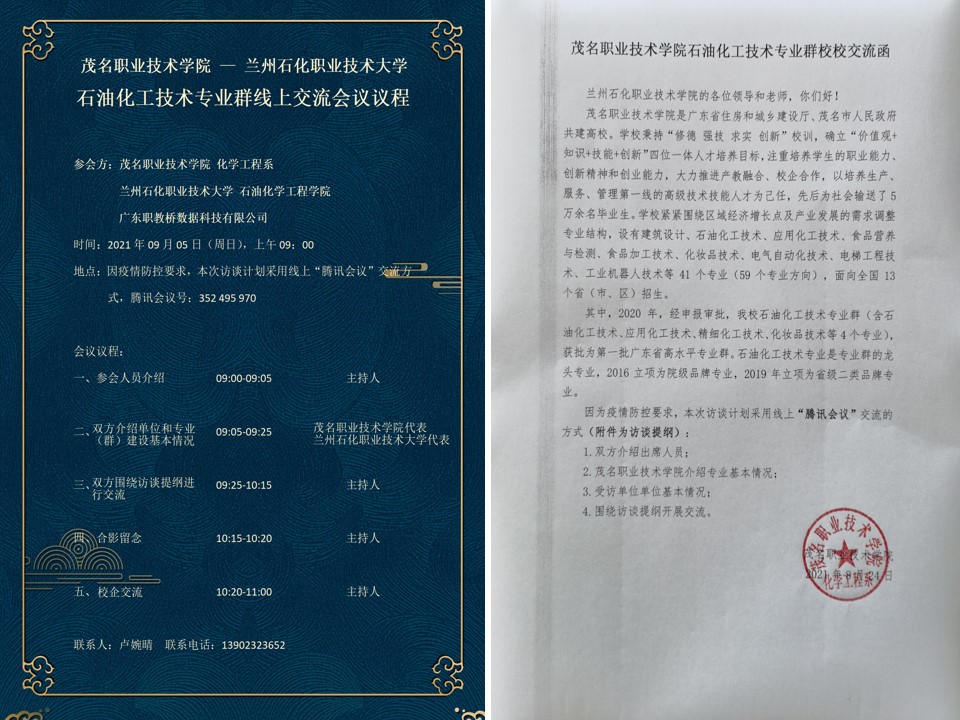 为促进我院石油化工技术高水平专业群建设,深化校校、校企合作交流,应茂名职业技术公司化工系邀请,于9月5日召开了石油化工技术高水平专业群建设线上交流研讨会。