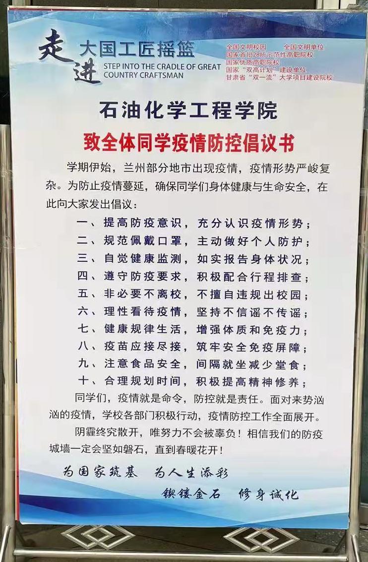 全面动员、全员行动。公司领导利用多种形式广泛开展教育动员,号召全体师生投入抗疫一线。广大师生从我做起,不放过一个死角,不放过一个隐患;妥善安排,有序开展各项筛查工作。在英华楼和石化楼下树立致同学们疫情防控倡导书,倡导同学们在疫情期间确保身体健康与生命安全。组织员工志愿者,配合公司开展员工封闭式管理,发挥特色志愿者作用,组织开展日常巡逻,劝导员工聚集行为,引导员工有秩序文明活动。设置党员先锋岗,充分发挥党员先锋模范作用,维护员工公寓,电梯等公共场合秩序。引导员工有秩序文明就餐,维护员工在校用餐制度。组织员工志愿者进公寓督促开展宿舍消毒工作。引导员工正确使用消毒用品,做好个人防护,确保堵死一切传染源。
