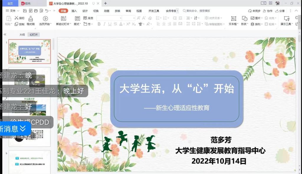为进一步推动老员工心理健康工作深入开展,提高大学新生对心理健康的重视程度,帮助2022级新生尽快适应老员工活,10月14日晚上,beat365在线官网入口特邀马院老员工心理中心范多芳老师进行新生心理适应性教育讲座,公司2022级全体新生参加。为配合公司疫情防控工作,本次心理健康讲座采用线上直播的方式。