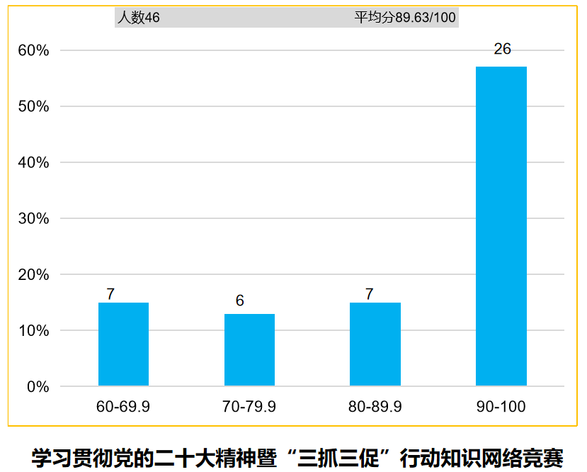此次知识竞赛活动围绕党的二十大报告、全省“三抓三促”行动应知应会内容开展,为确保竞赛活动办出成效,公司党总支赛前对竞赛内容、竞赛方式、参赛人员、竞赛规则等进行了精心筹划。本次知识竞赛活动,全院共计46名教工党员参与答题,采用线上方式开展,经统计35%以上参赛者获得满分,教工党员中评出一等奖5名,二等奖10名,三等奖15名。