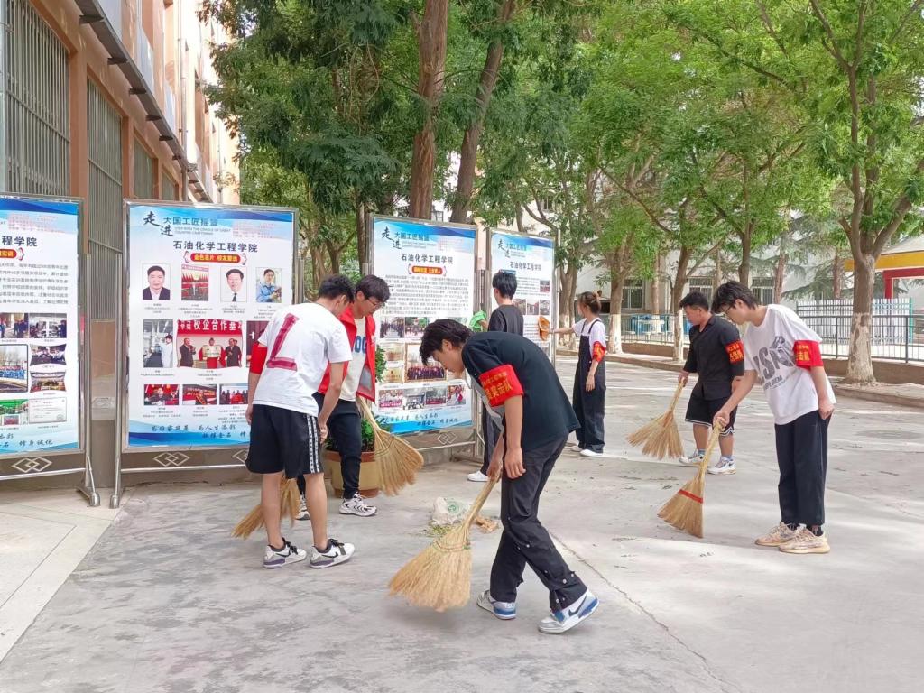 活动过程中,同学们精神饱满,各司其职,在做好个人防护的基础上,携带着分发的工具,认真清扫草丛里和路边的废弃瓶子、纸屑、塑料袋,仔细擦拭桌子、地面、展板以及卫生死角的灰尘,一拾一捡,彰显着石化精神,一擦一拭,蕴含着石化情怀,志愿者不怕苦、不怕累、不怕脏,用笑容消除酷暑,以热情化解疲劳,充分发扬“奉献、友爱、互助、进步”的志愿服务精神,劳动之衷,在于品格的提升,劳动之美,在于坚持的身影,一幅幅忙碌的画面、一个个流汗的背影、一段段温暖的交流绘制着这个毕业季最动人的风景。经过半天的志愿服务活动,公司学习、生活环境焕然一新,望着用劳动创建的美好绿色校园,师生们脸上都洋溢出幸福的笑容。