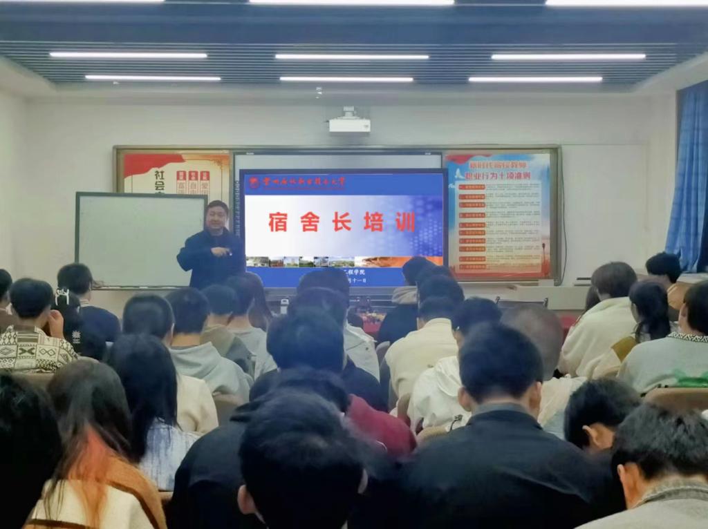 培训会上,员工管理老师带领全体宿舍长学习了《宿舍长职责》、《宿舍管理“十不准”》、《宿舍文明公约》、《员工公寓宿舍卫生安全标准》等相关文件要求,并围绕“心理健康标准”、“人际交往原则”、“人际交往策略”展开专题讲座,分析了高校员工宿舍人际关系矛盾的产生原因、造成的影响、改善的必要性及对策。会议最后,老师再次针对宿舍用水、用电、用火安全等方面进行重点强调,并要求宿舍长明确岗位职责,树立主动服务意识,发挥模范引领作用,关心宿舍成员,守牢安全底线,努力构建友爱和谐安全的文明标兵宿舍。